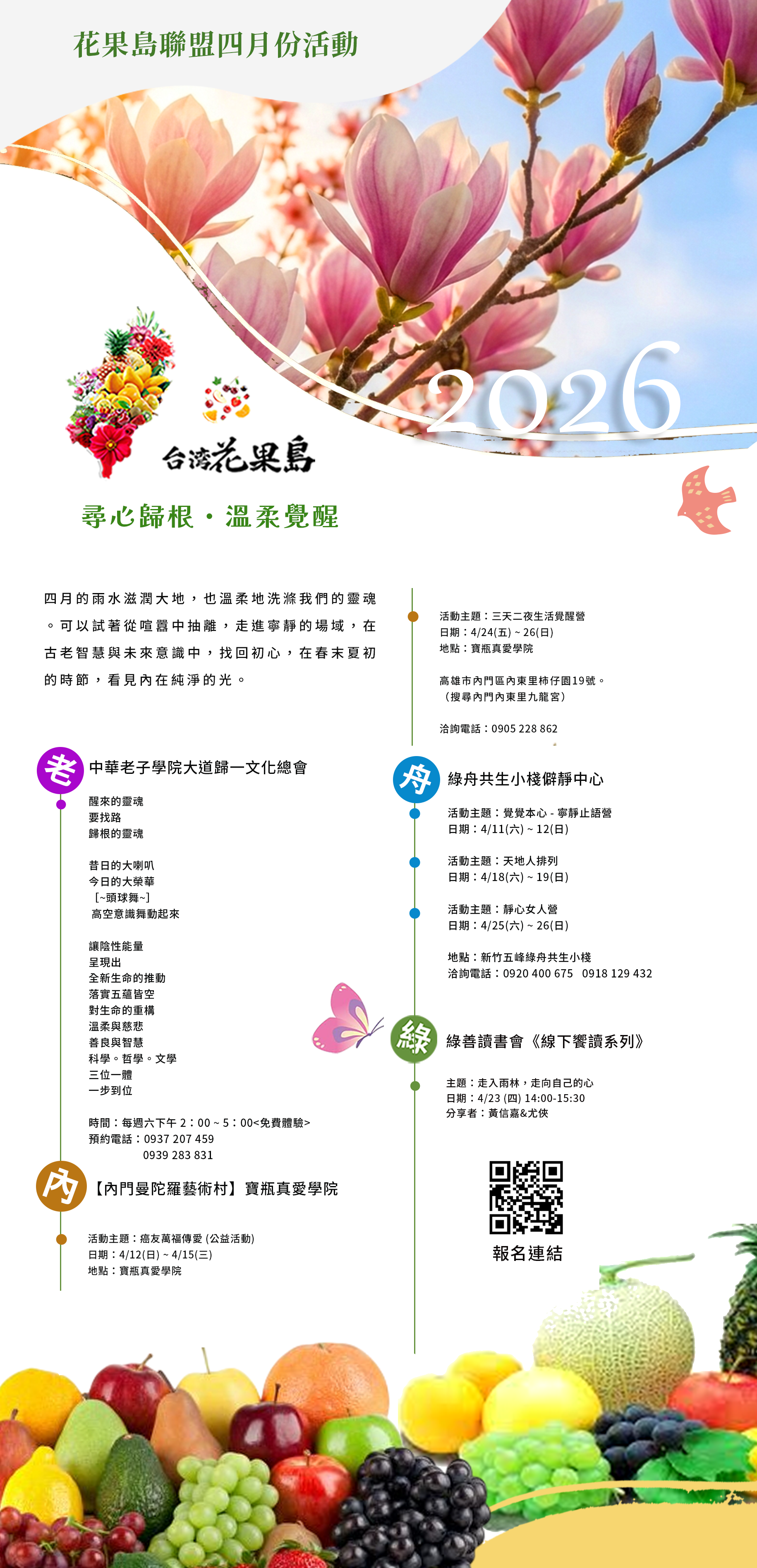 台灣花果島是一個教育、療癒聯盟平台,2020年由十個姊妹同心共願,共同發起,以推動身心教育、守護大地,讓台灣成為花果島、有機島、生態島、療癒島、能量島,進而成為世界療癒中心,影響全世界人們的生活樣貌!