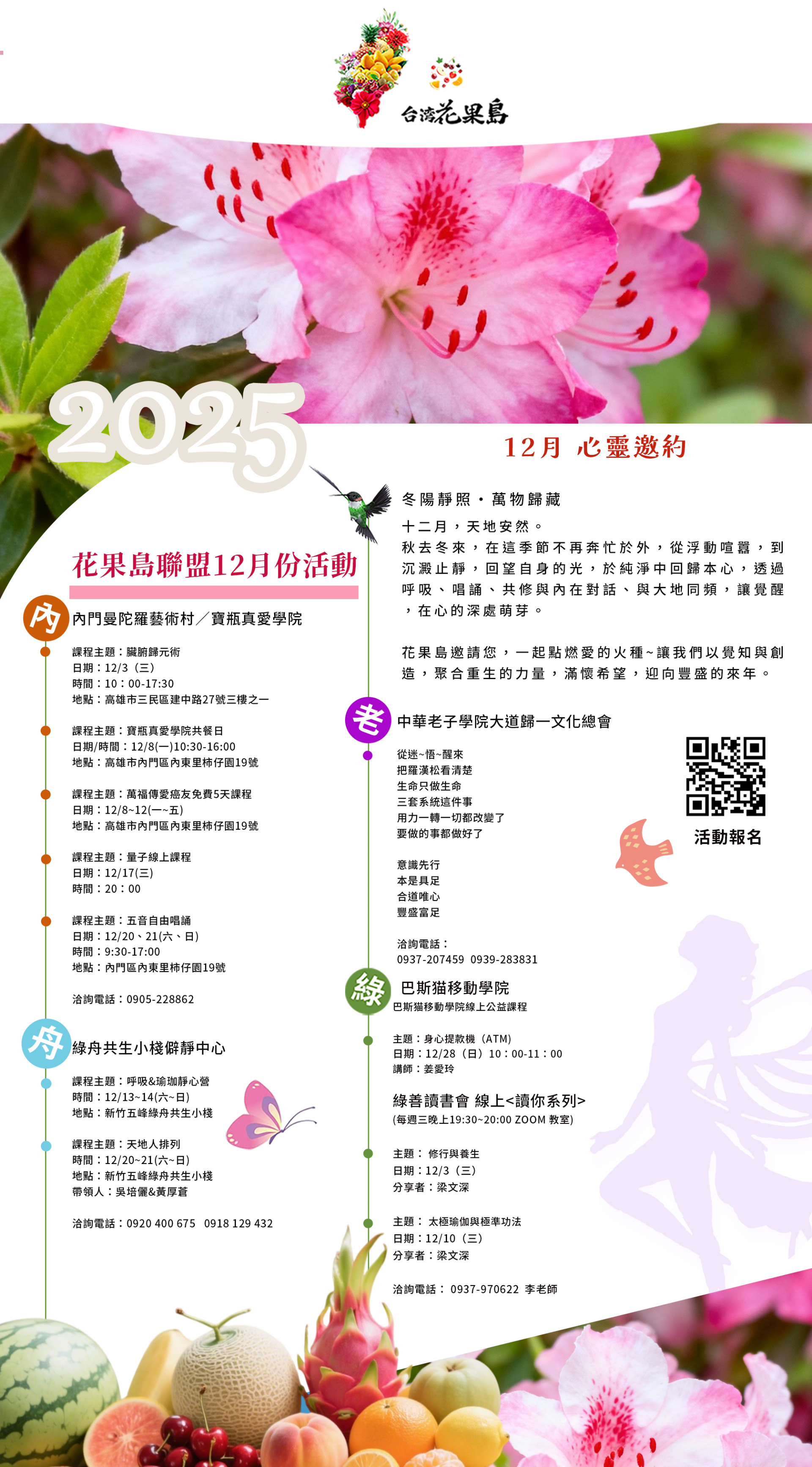 台灣花果島是一個教育、療癒聯盟平台,2020年由十個姊妹同心共願,共同發起,以推動身心教育、守護大地,讓台灣成為花果島、有機島、生態島、療癒島、能量島,進而成為世界療癒中心,影響全世界人們的生活樣貌!